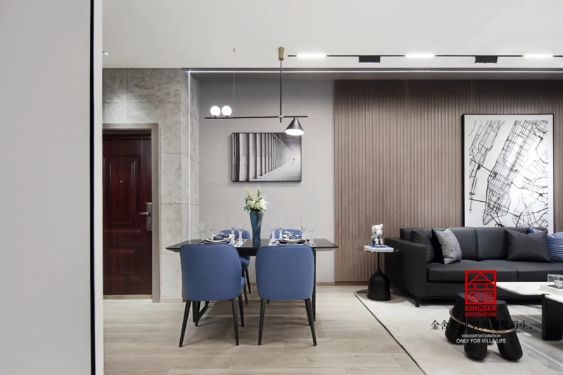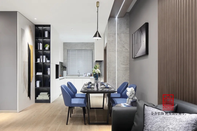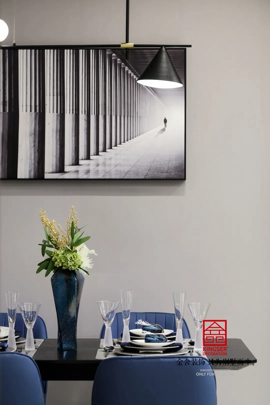 餐廳中運(yùn)用灰藍(lán)色色調(diào),無需過多裝飾,簡約才是生活本味。整體的空間較小,能滿足基本的功能。在方寸間也能表現(xiàn)出一種舒適的感覺。