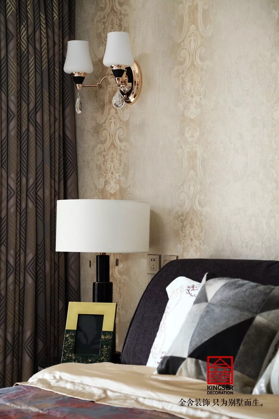 設(shè)計說明:此案例為石家莊金舍裝飾-國富華庭180平米現(xiàn)代簡約裝修實景。黑白相配的吊燈,半亞光迷彩感十足的床品配合黑色時尚的軟床呈現(xiàn)豐富的層次感,在陽光的映襯下呈現(xiàn)出一個充滿溫馨與質(zhì)感的空間,床上的金色飾品將房子的格調(diào)瞬間提升了起來。